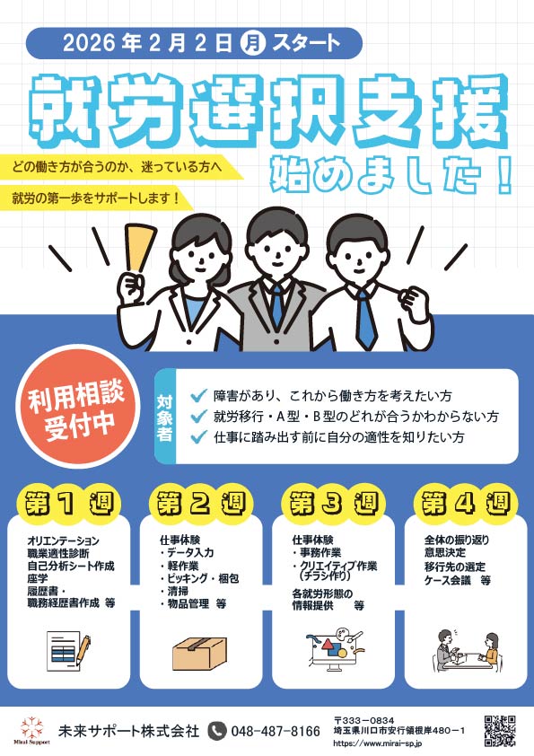 未来サポート株式会社では、2026年2月より就労選択支援を始めました。